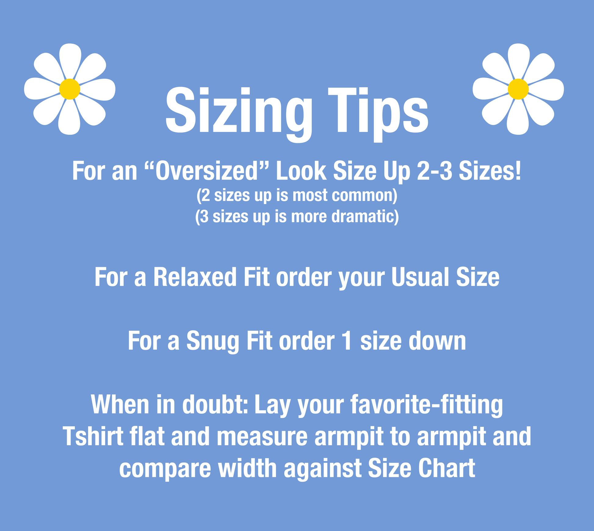 Size up 2-3 sizes from your "usual size" to get the "Oversized" Look! (2 sizes up is most common) (3 sizes up is more dramatic). For a "relaxed fit" order your "usual size". When in doubt, lay your favorite fitting Tshirt or Sweatshirt flat and measure armpit to armpit and compare the width against the Size Chart in the photos.