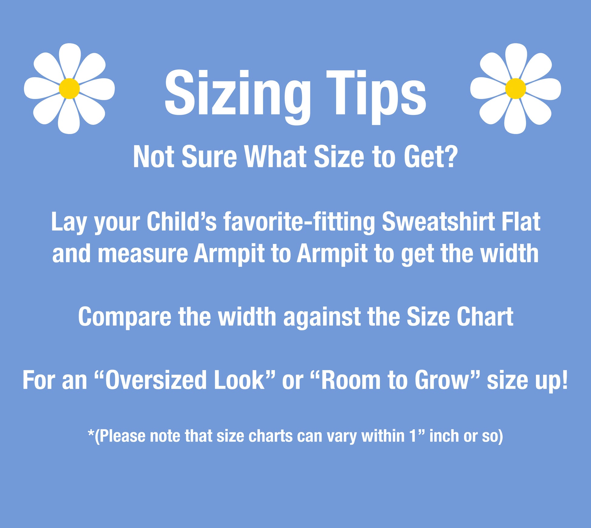 SIZING TIPS: Choose your child's "usual size" for a "Relaxed Fit" (not Oversized). If you prefer an "Oversized Look", size up 2 sizes from your child's usual size. If you are not sure what size to choose, lay your child's favorite fitting Sweatshirt flat and measure armpit to armpit and compare the width against the Size Chart in the photos. *Keep in mind that Size Charts can vary within 1" inch.