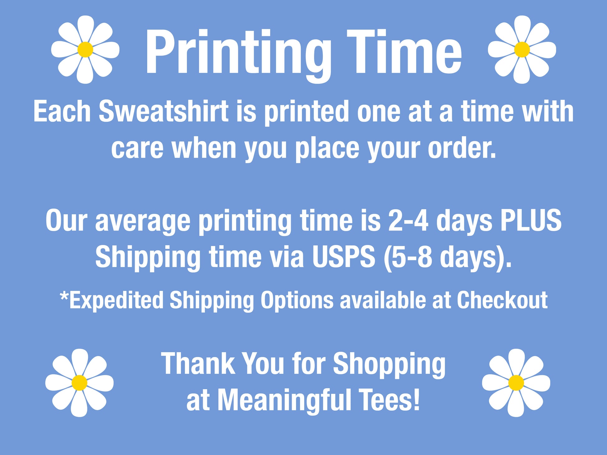 PROCESSING TIME: Each Hoodie is printed one at a time with care when you place your order. Our "average" printing time is 2-4 days including weekends PLUS Shipping time via USPS (5-8 days). Expedited shipping options available at checkout.