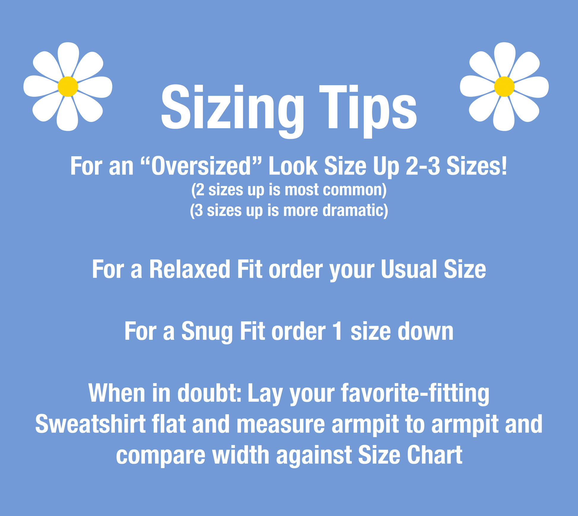SIZING TIPS: Size up 2-3 sizes from your "usual size" to get the "Oversized" Look! (2 sizes up is most common, and 3 sizes up is more dramatic) For a "relaxed fit" order your "usual size". When in doubt, lay your favorite fitting Sweatshirt flat and measure armpit to armpit and compare the width against the Size Chart in the photos.