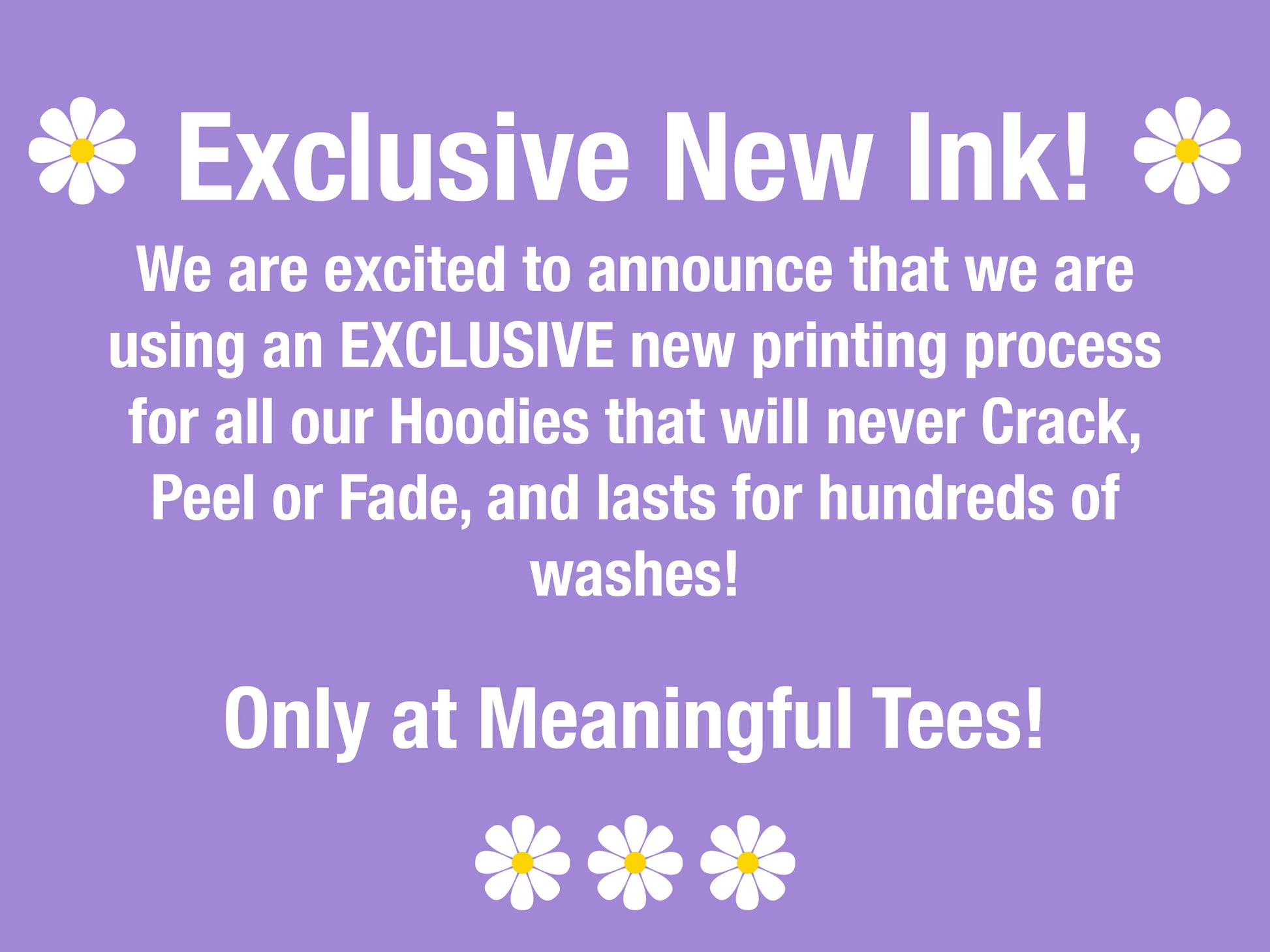EXCLUSIVE NEW INK: We are excited to announce that we are using an EXCLUSIVE new printing process for all our Hoodies that will never Crack, Peel or Fade, and lasts for hundreds of washes! Only available at Meaningful Tees!